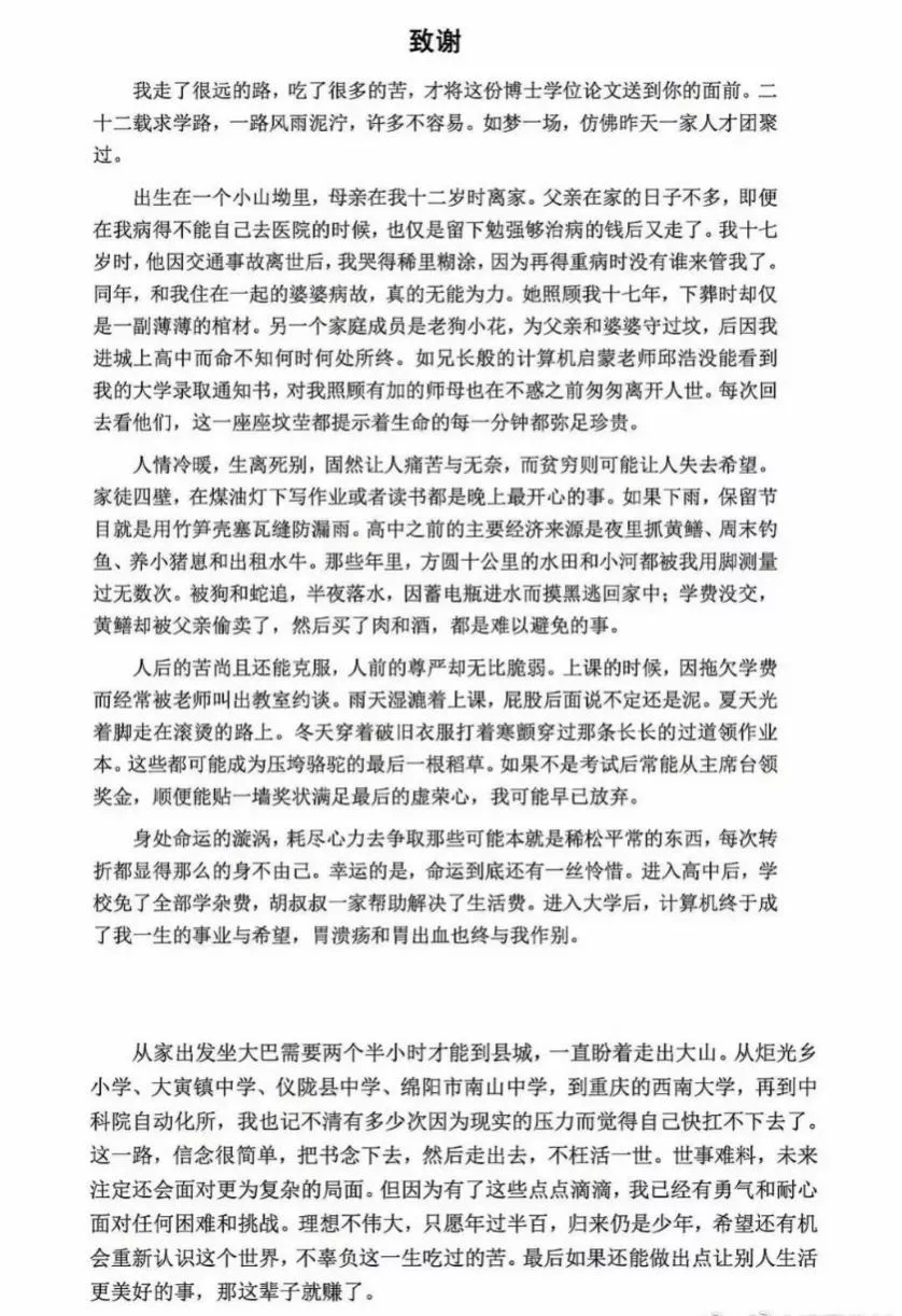 而近日博士论文致谢在朋友圈、微博刷屏的原因也在于此,在社会阶层日益固化与教育资源向中产和上产姐姐倾斜的大背景下,“寒门再难出贵子”的论调屡见不鲜,而“劳其筋骨,饿其体肤,空乏其身,行拂乱其所为,所以动心忍性,曾益其所不能”,寒门学子克服万难的客观环境,努力学习与不断向上的精神变得格外的难能可贵,也使公众往往为之动容。