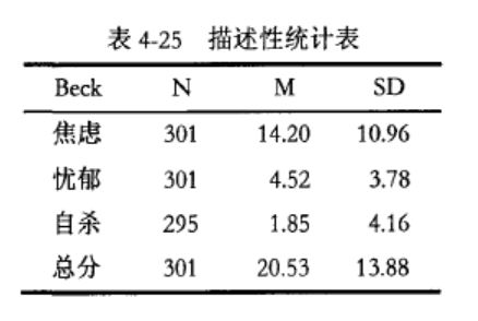 对于自杀意愿研究,研究者采用的是贝克自杀意念量表,共收到有效问卷295份。自杀意愿平均数是1.85,分数极低。